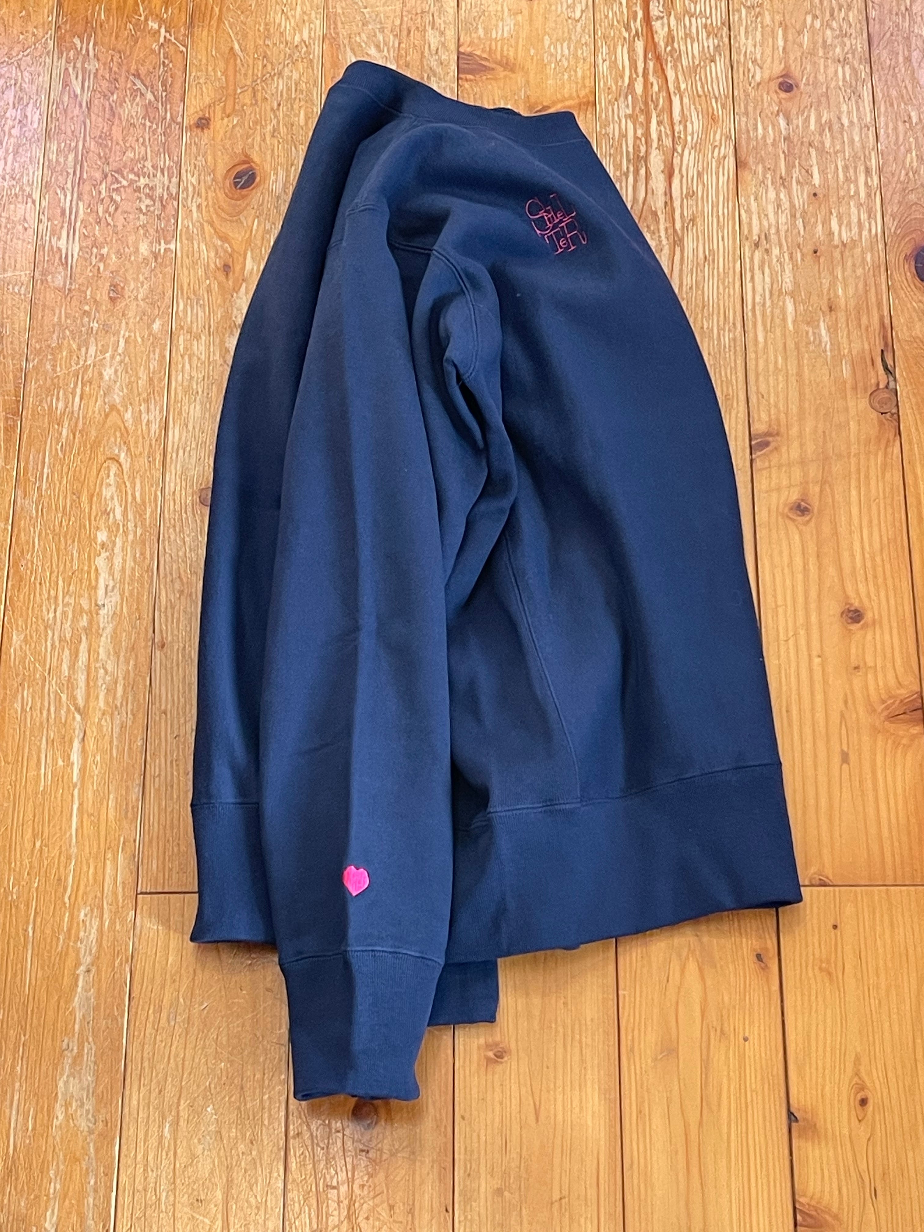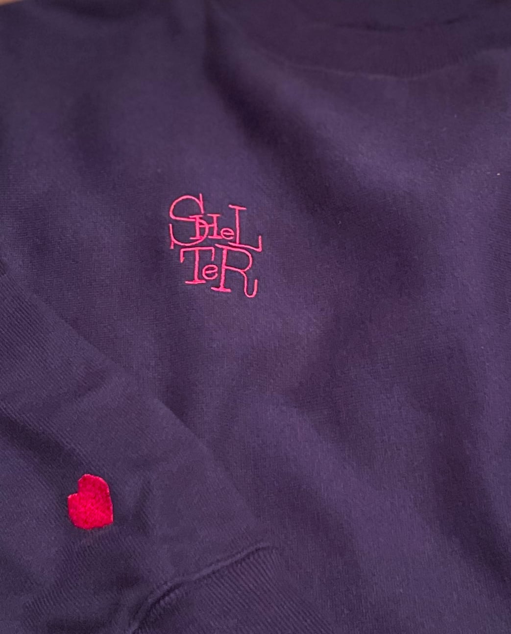 サイドリブと幅広のリブがヴィンテージ風のスウェットにSHeLTeRのロゴを右胸にハート・ロゴを右手首に刺繍したヘビーウェイトスウェットです。
