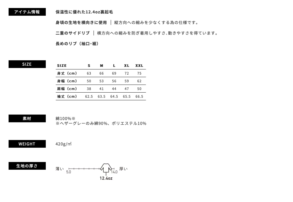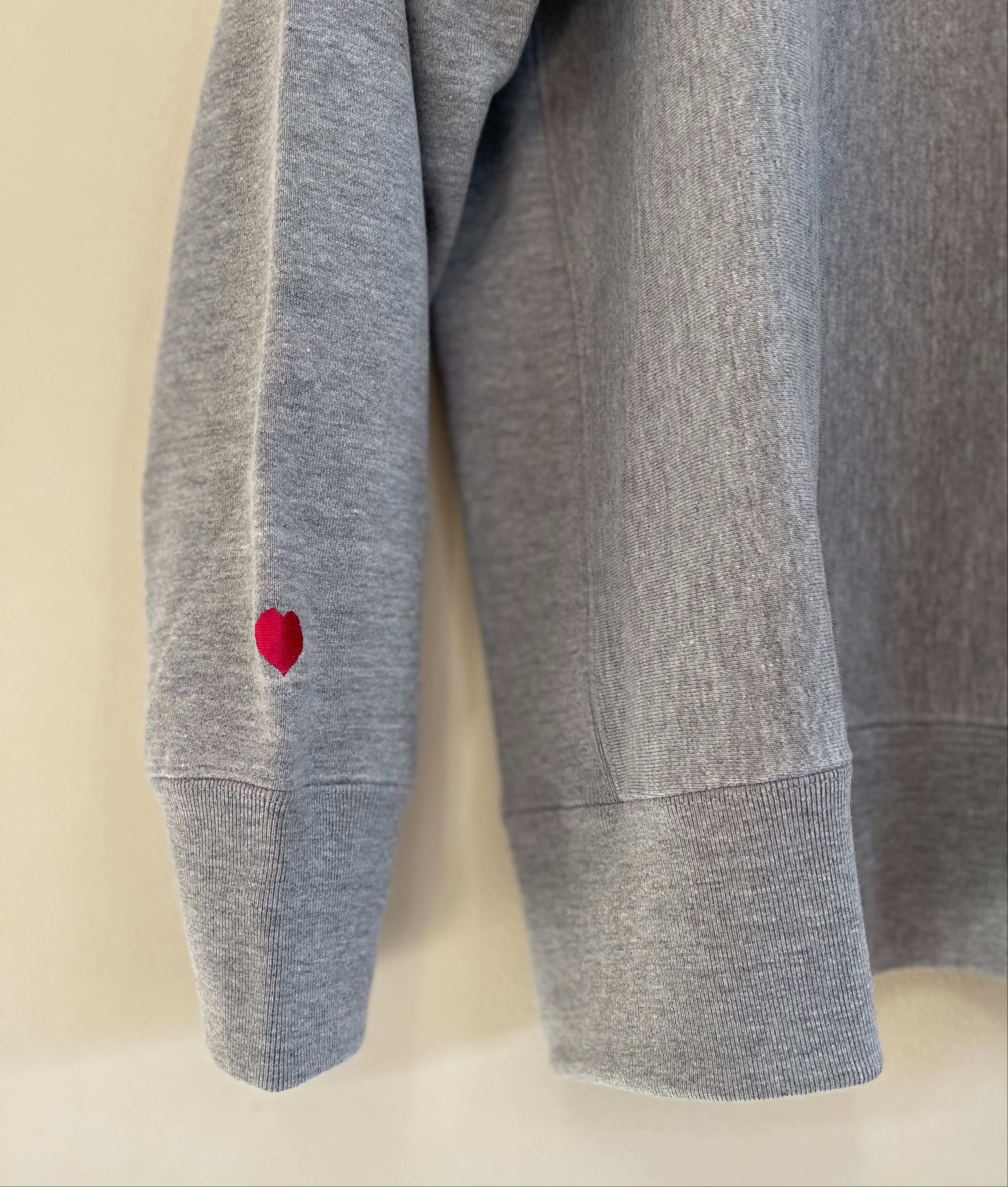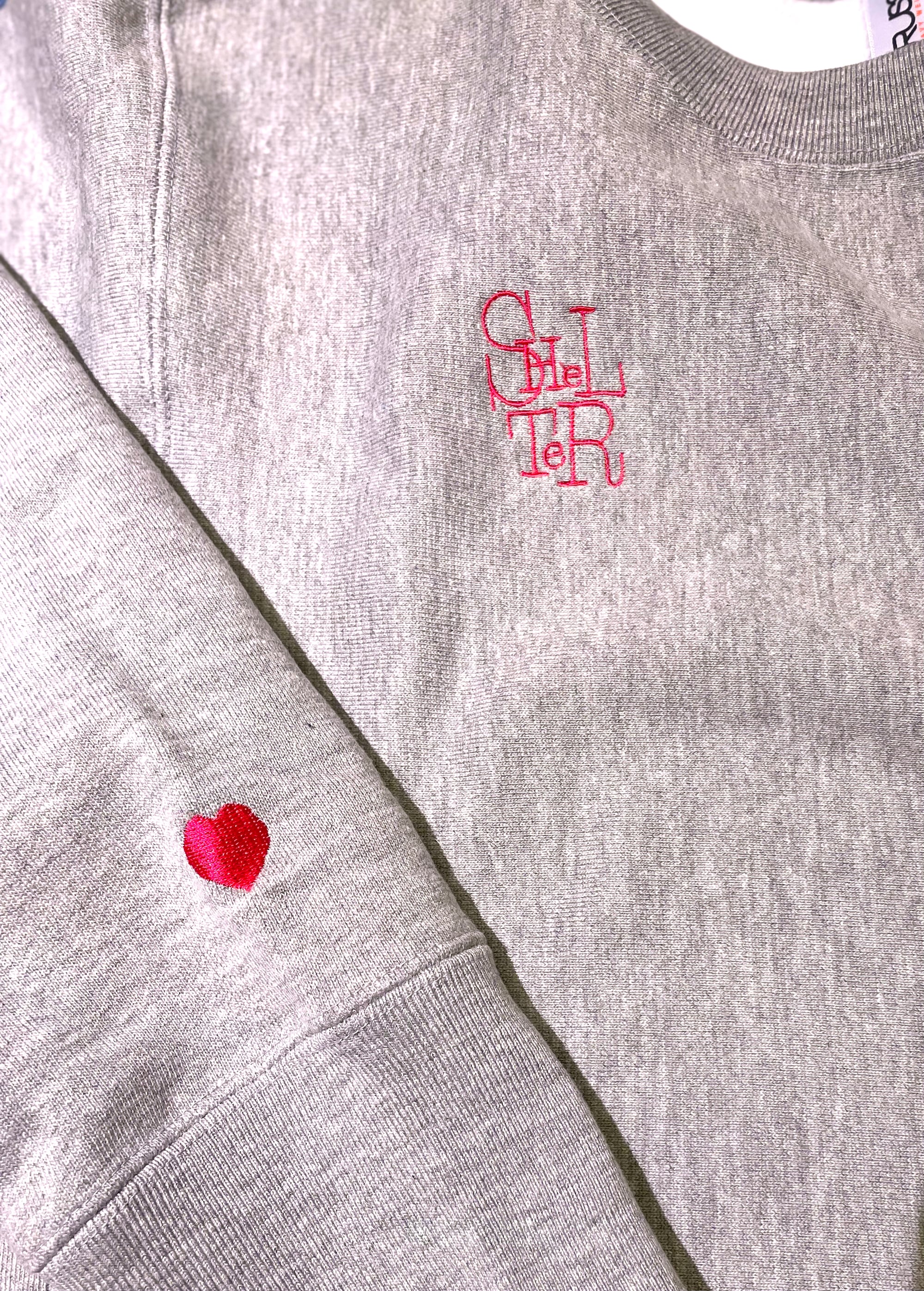 サイドリブと幅広のリブがヴィンテージ風のスウェットにSHeLTeRのロゴを右胸にハート・ロゴを右手首に刺繍したヘビー ウェイト スウェットです。