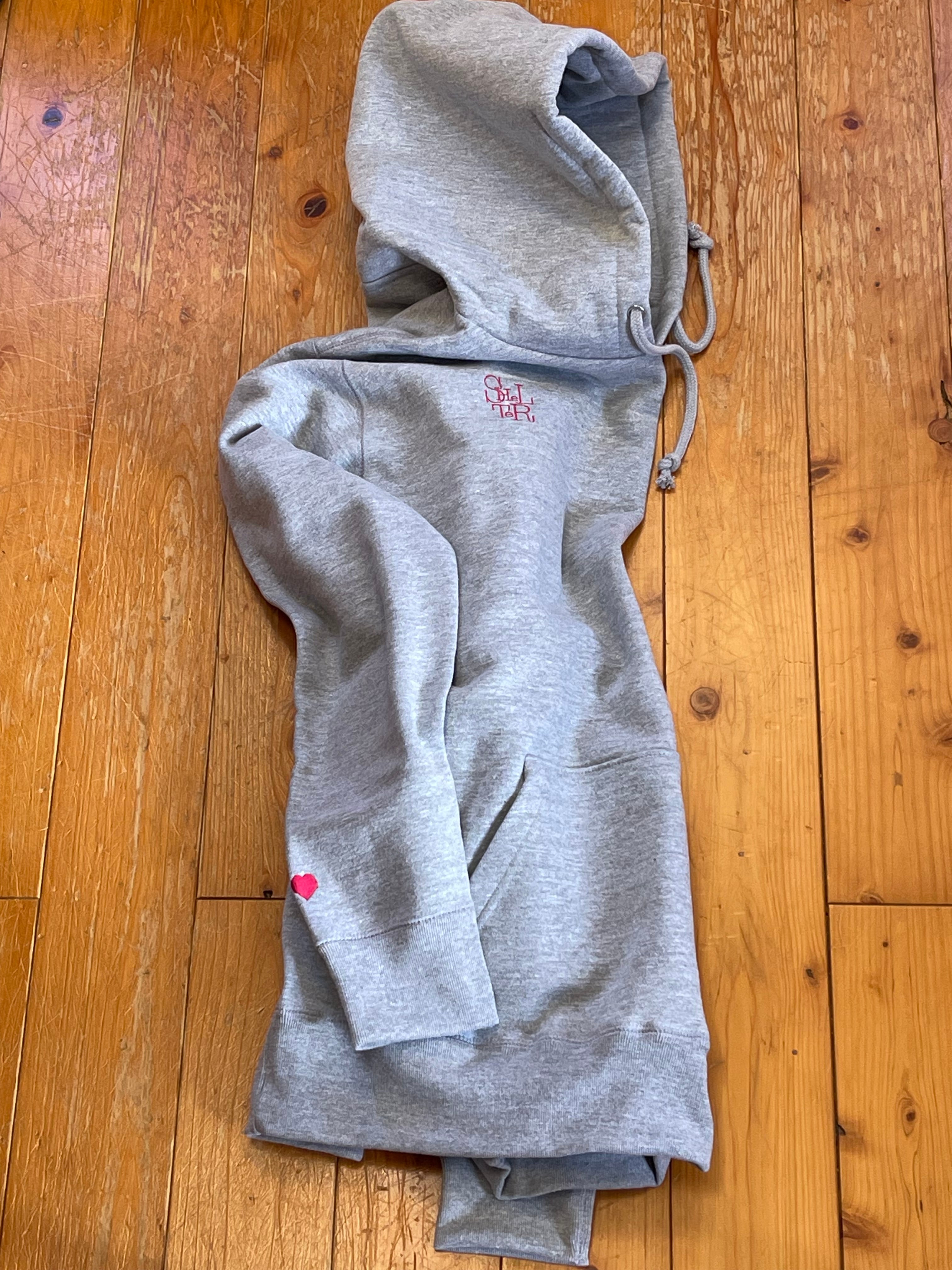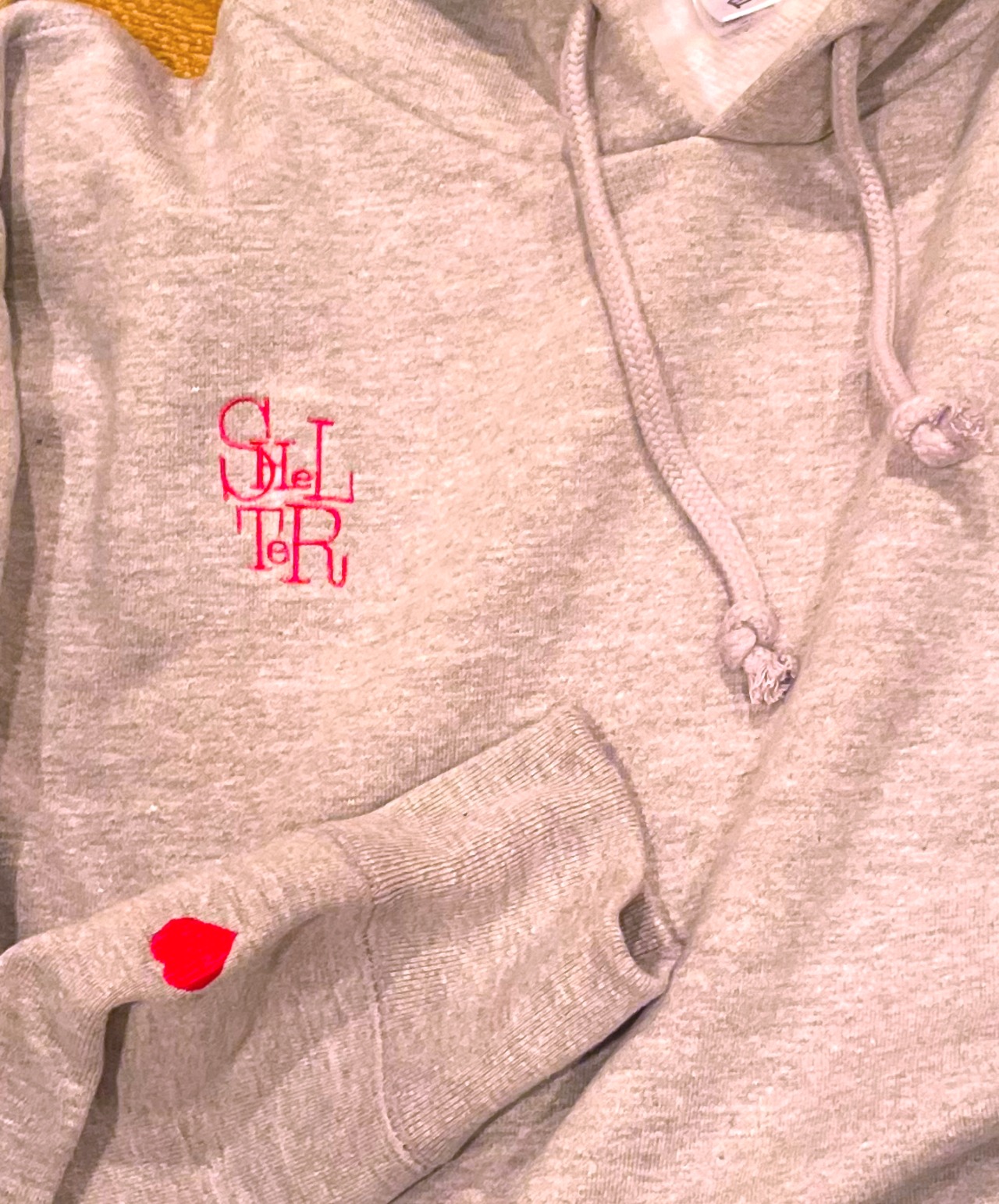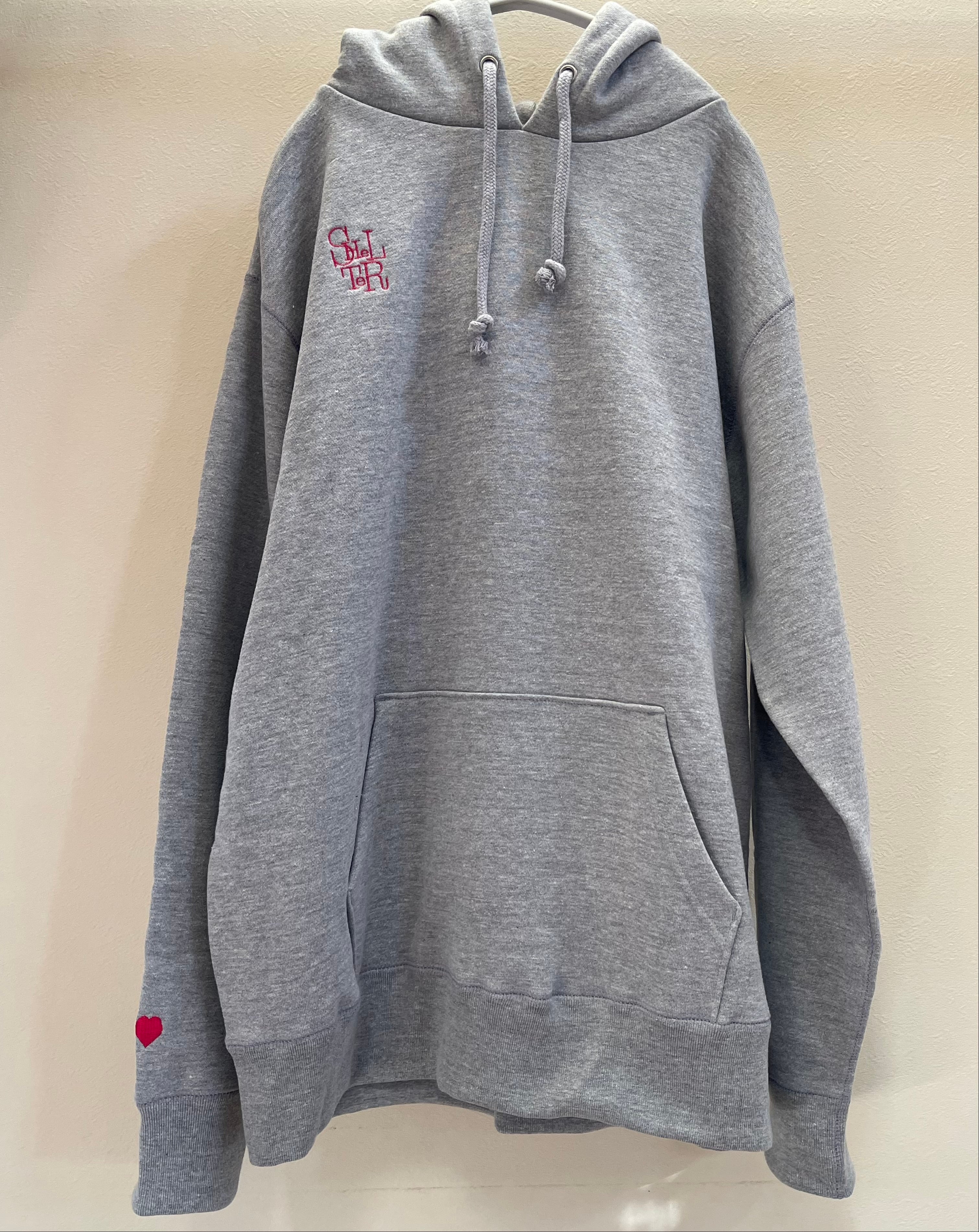 タフな厚手生地の裏起毛パーカにSHeLTeRのロゴを右胸にハート・ロゴを右手首に刺繍したヘビーウェイトパーカです。